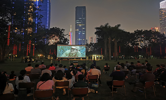 3月17日,夜幕降臨,廣州市演出電影公司的工作人員珠江公園大草坪豎起了雪白的大銀幕,在微芒路燈的點綴下格外顯眼,銀幕上隨后放映起紅色影片《萬里歸途》。現(xiàn)場座無虛席,一旁不停有市民游客駐足觀看。據(jù)悉,這正是我市如火如荼開展的英雄花開英雄城系列活動之紅棉展映中的一場。